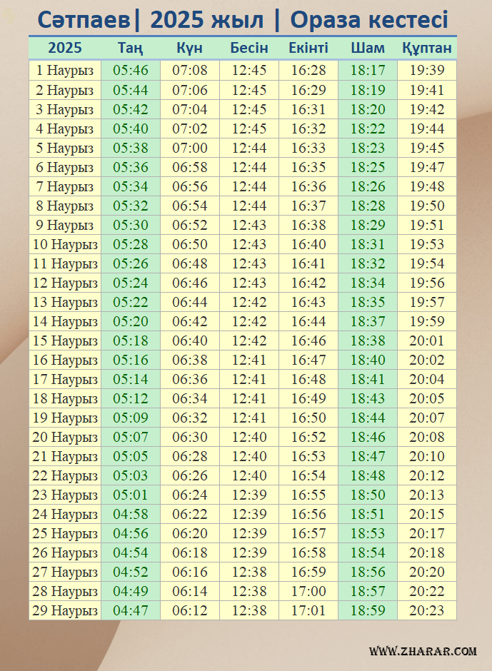 2025 жылғы Рамазан айына арналған Сәтпаев қаласының намаз уақыттары, ауыз бекіту және ауыз ашу мерзімдері көрсетілген ораза кестесін назарларыңызға ұсынамыз.