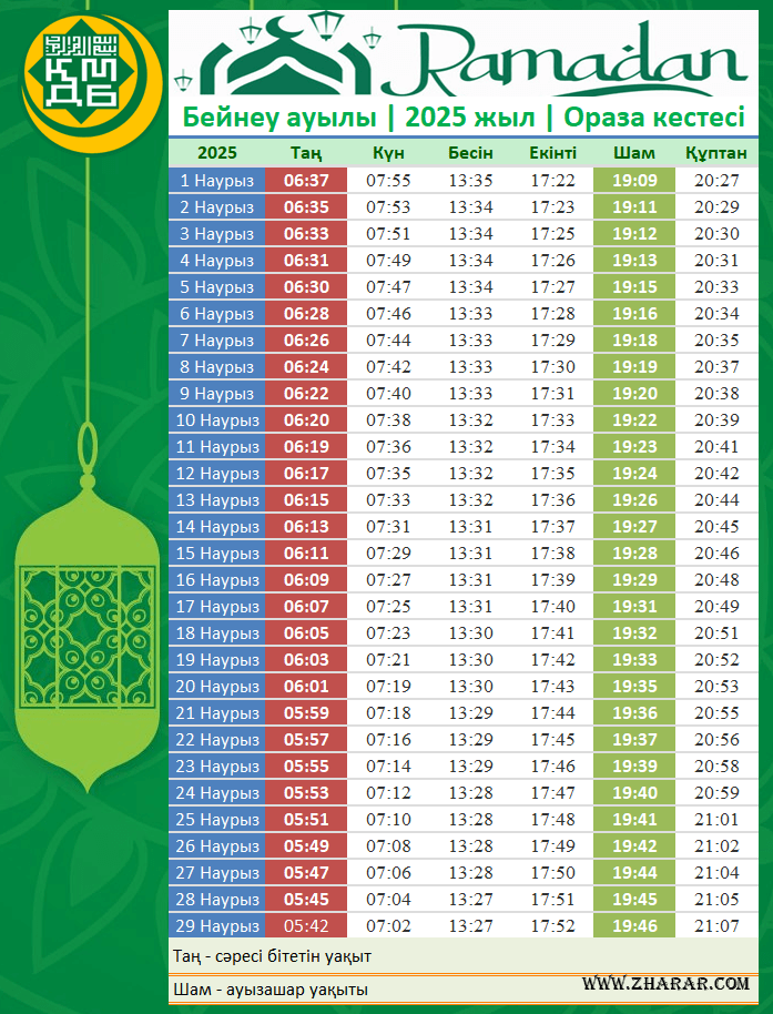 2025 жылғы Рамазан айына арналған Бейнеу ауылының намаз уақыттары, ауыз бекіту және ауыз ашу мерзімдері көрсетілген ораза кестесін назарларыңызға ұсынамыз.