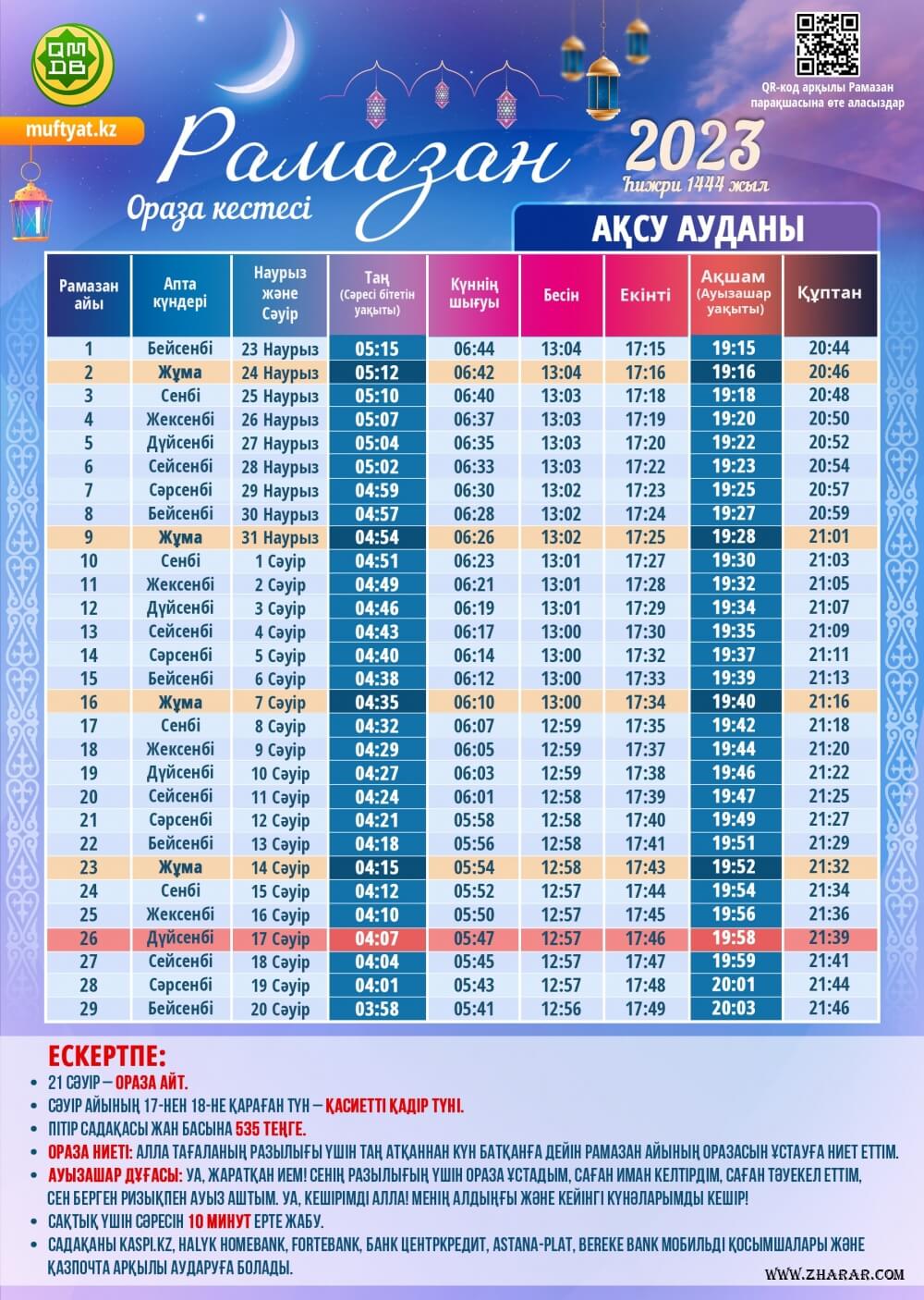 Ақсу ауданы. 2023 жылғы ораза кестесі