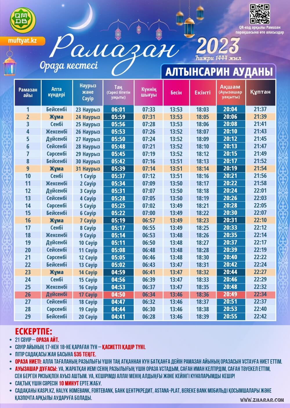 Алтынсарин ауданы. 2023 жылғы ораза кестесі