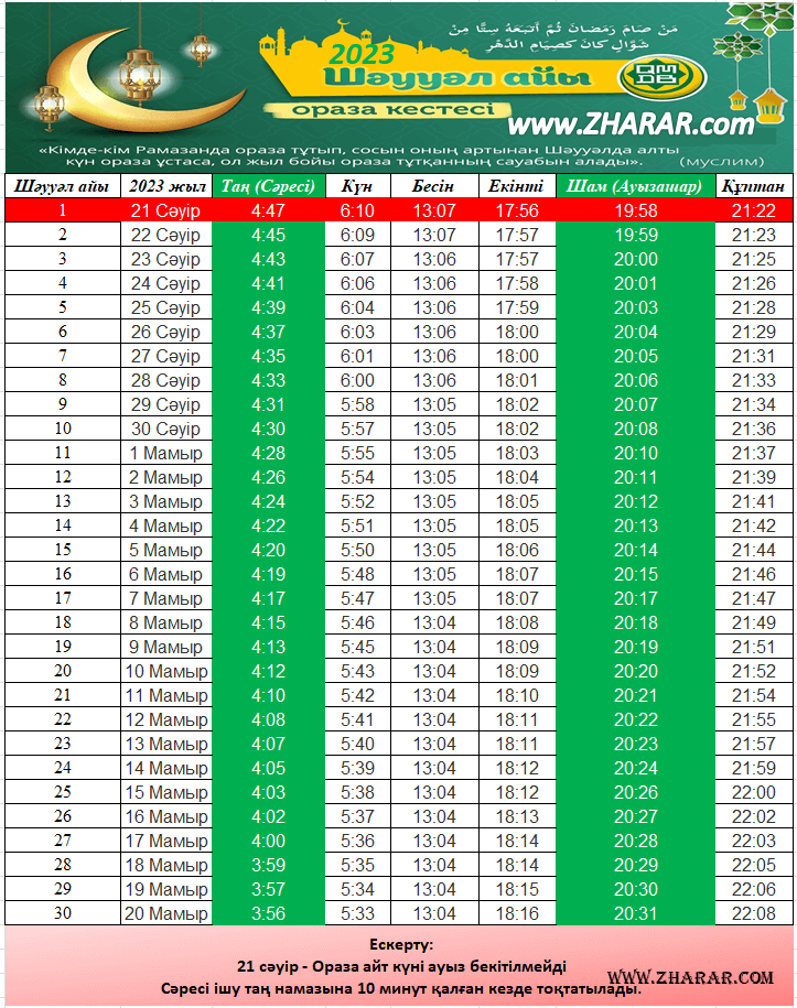 Шу қаласы: 2023 жылға Шәууәл ораза кестесі