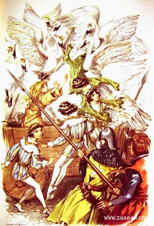 Қолындағысын жұлып алмақ болып, олар Элизаны қоршай бастады. Сол кезде он бір аққу ұшып келіп, арбаның жақтауына қаз-қатар қонды да, қарындасын өз тәндерімен қалқалап, қуатты қанаттарымен сабалап, ащы да мұңлы сұңқылға басты.