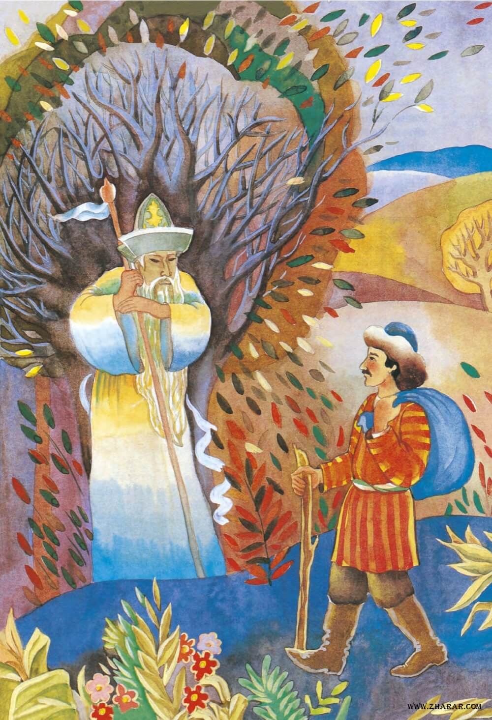 – Бақытты таптым, ол саған айтты: ағаштың түбінде бір өгіз тұлып алтын бар екен, соны алып, орнына топырақ салса ағашың жеміс береді деді, – дейді. Бұны естігенде шал қуанып жігітке: