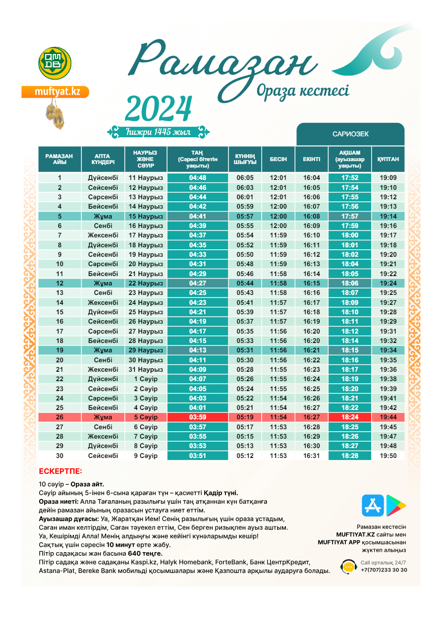 Сарыөзек бойынша намаз оқу, ауыз бекіту және ауыз ашу уақыты көрсетілген 2024 жылға арналған ораза кестесін ұсынамыз. Сарыөзек — Жетісу облысы Кербұлақ ауданындағы ауыл