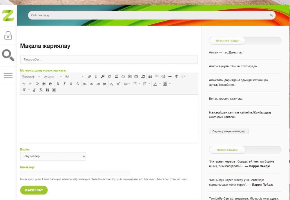 Сәлеметсіздерме, құрметті оқырмандар! Zharar сайтының жаңа бөлімі ашылды, яғни мында оңай әрі тез мақал-мәтелдер, жұмбақтар, әңгімелер, ертегілер, тақпақтар, өлеңдер, баталар, поэмалар, құттықтаулар, нақыл сөздер және туындылар жариялауға болады.